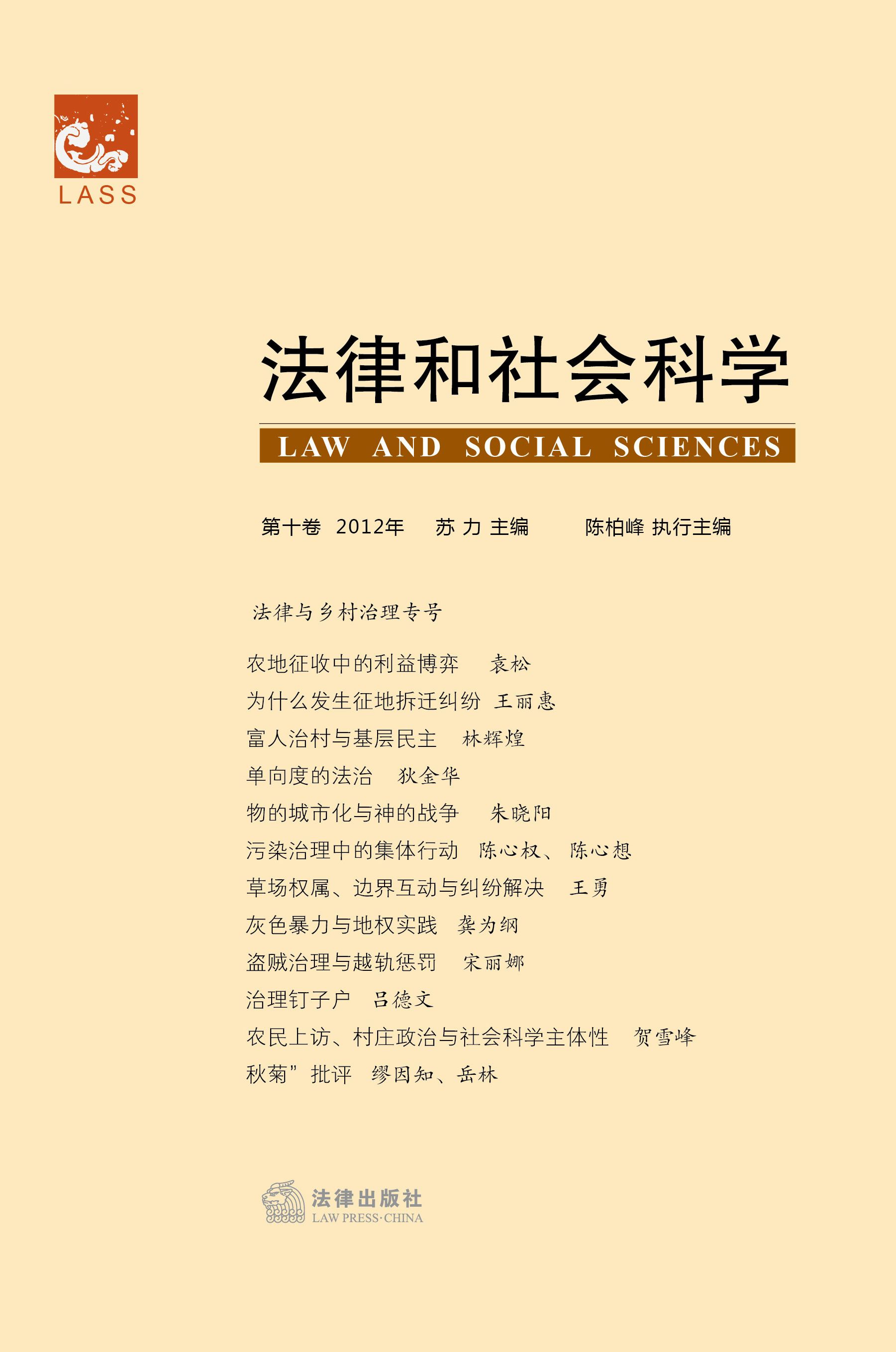 - 2012年,由蘇力主編,陳柏峰執(zhí)行主編的《法律與社會(huì)科學(xué)》第十卷由法律出版社出版。本卷為“法律與鄉(xiāng)村治理專號(hào)”,主要收錄了中心研究人員在法律社會(huì)學(xué)方面的研究成果。