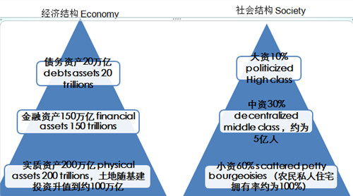 經(jīng)濟結(jié)構(gòu)上我們是個金字塔,底座是龐大的物質(zhì)財產(chǎn)。為什么?因為過去我們龐大的物質(zhì)財產(chǎn)沒有被貨幣化,在1992年之前中國所有的物資供應(yīng)靠國家計劃分配,老百姓的消費靠票證來決定,從1992年我們放棄了所有的票證,中國進入了貨幣化元年,于是貨幣大幅度增發(fā),同期中國開始放開了三大最能吸納貨幣的市場——房地產(chǎn)、期貨和證券,帶動了中國經(jīng)濟的高增長,這個過程實際上把過去沒有貨幣化的實物資產(chǎn)變成了貨幣化的可交換的金融資產(chǎn),于是在龐大的實物資產(chǎn)這個底座上成長出來了一塊金融資產(chǎn)。我們的實物資產(chǎn)有多少呢?現(xiàn)在大約有200萬億;我們的金融資產(chǎn)有多少呢?大約有150萬億;再上邊就是所謂債務(wù)資產(chǎn)20萬億,債務(wù)相對占的比重還是最少的,所以我們才說它是一個正的金字塔結(jié)構(gòu),底座是龐大的物質(zhì)資產(chǎn)。