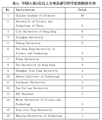 中國入選3名以上全球高被引科學(xué)家的院校名單
