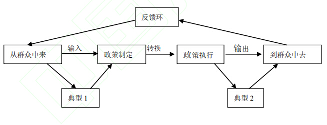 在分析典型的生產(chǎn)機(jī)制之前,有必要從政策過程的角度構(gòu)建一個(gè)關(guān)于典型生產(chǎn)的理想模型。這個(gè)模型在“從群眾中來,到群眾中去”的領(lǐng)導(dǎo)工作方法的基礎(chǔ)上,借鑒了戴維·伊斯頓的政治系統(tǒng)論[],將其擴(kuò)展成一個(gè)完整的政策過程。在理想形態(tài)下,典型在這個(gè)過程中有兩個(gè)產(chǎn)生機(jī)會(huì)。具體見下圖1: