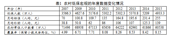 民政部官方網(wǎng)站上可獲取的民政部工作報(bào)告僅有2010至2015年這6個年度,2007年的農(nóng)村低保相關(guān)數(shù)據(jù)取自于雷曉康等2009年的研究,2009年的相關(guān)數(shù)據(jù)可根據(jù)2010年的報(bào)告進(jìn)行推算,2008年的數(shù)據(jù)缺失。由此獲得農(nóng)村低保的相關(guān)宏觀數(shù)據(jù)詳見表1。