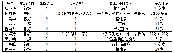 從表2可知,9戶“低保戶”中沒有一戶全戶獲保,且11個低保人,11個都屬于癡呆病傻的類型,而只有2人是真的貧困。由此可見,農(nóng)村低保對象在執(zhí)行中所瞄準(zhǔn)的目標(biāo)群體并不是家庭人均年收入低于絕對貧困線的貧困群體,而是農(nóng)村中除去明顯不符合衍生的識別標(biāo)準(zhǔn)規(guī)定的農(nóng)戶之外的其余農(nóng)戶中最不健康的人群,即農(nóng)村低保對象發(fā)生實(shí)質(zhì)性偏離。