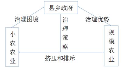 地方治理便利化,是指地方政府面對小農(nóng)農(nóng)業(yè)和規(guī)模農(nóng)業(yè)帶來的不同治理效果,為了使地方農(nóng)業(yè)治理更加便利,而采取不同的治理策略,從而影響農(nóng)業(yè)發(fā)展方向的過程。本文中的地方政府主要是指作為農(nóng)業(yè)治理直接主體的縣鄉(xiāng)政府。在這一分析框架內(nèi),主要包括三對相互關(guān)聯(lián)的關(guān)系:縣鄉(xiāng)政府與小農(nóng)農(nóng)業(yè)、縣鄉(xiāng)政府與規(guī)模農(nóng)業(yè)和小農(nóng)農(nóng)業(yè)與規(guī)模農(nóng)業(yè),如圖1所示: