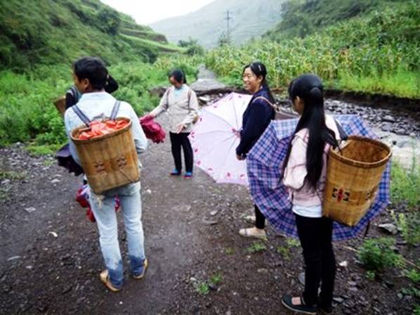 照片14,冒雨下山趕集的山民,這么點(diǎn)小孩如何趟過(guò)激流?雨越下越大,河水不斷上漲。他們回來(lái)時(shí)遇上山洪怎么辦?