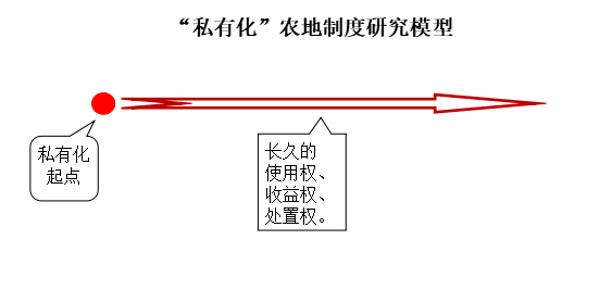 返觀現(xiàn)行農(nóng)地制度,其核心政策是,強(qiáng)調(diào)穩(wěn)定土地承包關(guān)系,嚴(yán)禁進(jìn)行土地調(diào)整。具體來(lái)說(shuō),“起點(diǎn)”實(shí)行延包政策,不支持“起點(diǎn)公平”(土地調(diào)整);“期內(nèi)”實(shí)行嚴(yán)禁土地調(diào)整的政策,以保持土地承包關(guān)系長(zhǎng)期穩(wěn)定。如果農(nóng)村集體經(jīng)濟(jì)組織一直嚴(yán)格執(zhí)行這兩方面的政策,即:一輪承包期內(nèi)(15年)從不進(jìn)行土地調(diào)整;二輪承包起點(diǎn)也不進(jìn)行土地調(diào)整,二輪承包期內(nèi)(30年)也不進(jìn)行土地調(diào)整;三輪承包起點(diǎn)也不進(jìn)行土地調(diào)整,三輪承包期內(nèi)(30年或更長(zhǎng))也不進(jìn)行土地調(diào)整;……。也就是說(shuō),實(shí)行家庭承包制以后從不進(jìn)行土地調(diào)整。顯而易見(jiàn),執(zhí)行這樣政策的結(jié)果是,與實(shí)行土地私有化幾乎沒(méi)有什么兩樣。私有化農(nóng)地制度的基本特點(diǎn)就是,在起點(diǎn)實(shí)行私有化,以后永遠(yuǎn)不再進(jìn)行土地重新分配。對(duì)于私有化農(nóng)地制度,也可作一個(gè)簡(jiǎn)要的研究模型(見(jiàn)下圖)。