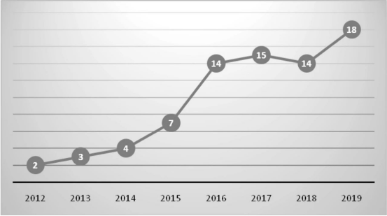從十八大到2019年8月,中國共產(chǎn)黨制定或修訂通過黨內(nèi)法規(guī)共77次,包括修改《黨章》2次,制定準(zhǔn)則2部,制定或修改條例22部,制定規(guī)則2部,制定規(guī)定21部,制定辦法14部,制定細(xì)則2部,制定規(guī)范性文件12份。而且,黨內(nèi)法規(guī)的數(shù)量基本呈逐年上升趨勢(見圖2),進(jìn)一步證明了黨的制度化政治勢能的增強(qiáng)。