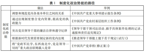 五是將“中國共產(chǎn)黨的領(lǐng)導(dǎo)是中國特色社會主義最本質(zhì)的特征,是中國特色社會主義制度的最大優(yōu)勢。黨政軍民學(xué),東西南北中,黨是領(lǐng)導(dǎo)一切的”這一重大政治原則載入十九大黨章,確保了黨領(lǐng)導(dǎo)國家的制度化和可持續(xù)性。表1展示了制度化政治勢能的路徑。