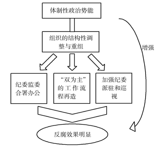 體制性政治勢能是對黨的紀(jì)檢機(jī)構(gòu)進(jìn)行結(jié)構(gòu)性調(diào)整與重組以進(jìn)行治國理政的一種方式。黨的最高紀(jì)檢機(jī)構(gòu)即中共中央紀(jì)律檢查委員會(簡稱“中紀(jì)委”),是中國共產(chǎn)黨的最高紀(jì)律檢查機(jī)關(guān),它不屬于任何政府部門,但服從中共中央委員會領(lǐng)導(dǎo)。十八大以來,新一屆黨中央對紀(jì)檢體制機(jī)制進(jìn)行了一系列的改革創(chuàng)新實(shí)踐,極大地增強(qiáng)了體制性的政治勢能,其做法包括紀(jì)監(jiān)合署辦公、工作流程再造、加強(qiáng)派駐機(jī)構(gòu)和巡視工作等措施(見圖3)。
